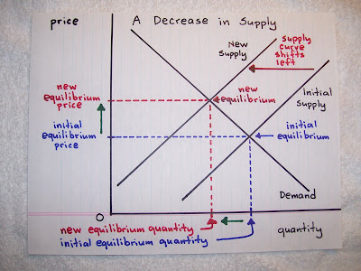 The key things to see in this graph are the words "Initial equilibrium" in blue, on the right, the red words "Supply curve shifts left" in the upper right, and the words "new equilibrium" in red in the center. The most important point is "new equilibrium". Prices will stabilize on the market at their new equilibrium point when there is a decrease in Supply. I will explain, in detail, why this occurs. In the current system prices are generally stable. Players have, at minimum, a general idea of what something is worth. Prices are generally "in the ballpark" of Equilibrium Price. Now we will assume, as your reasoning suggests, that Supply will lower. When there are more items willing to be bought at a price than items willing to be sold at a price that price is considered "below Equilibrium Price." When there is a decrease in Supply more items are willing to be bought at that price than willing to be sold at that price. Buyers will compete for the items available and raise their bids. As Supply decreases price increases. You acknowledge that there will be players willing to pay the prices when you said, I quote, "because there will always be people that have to have something immediately."