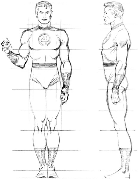 "Lets start with an average joe. Most average guys are abiout 6½heads tall. But take a look at this sketch of Reed Richards. Notice that he's 8¾ heads tall. If we draw a hero he's got to look like a hero. He should be of heroic proportions. Unfortunately, the normal 6½ head tall proportions would make him look somewhat dumpy in a Marvel mag..... a superhero simply has to look more impressive, more dramatic, more imposing than an average guy."